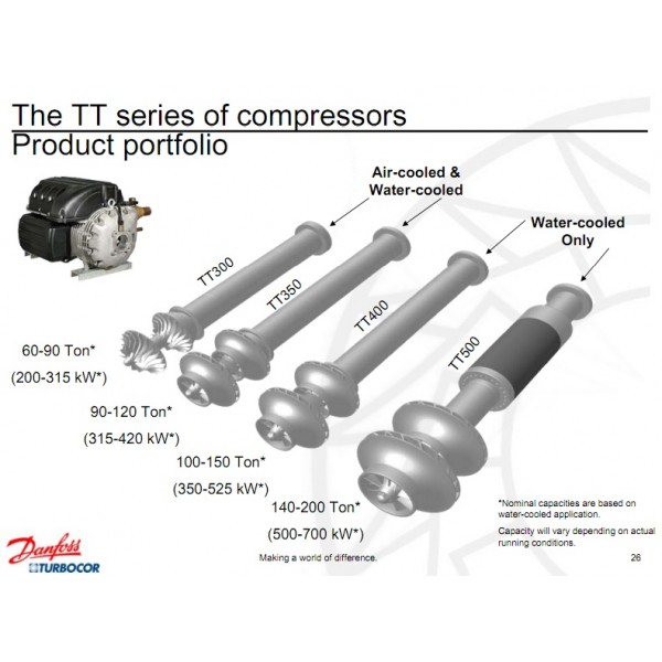The revolutionary Danfoss Turbocor is a proven family of compressors that have facilitated the convergence of proven magnetic bearing, variable speed centrifugal compression and digital electronic technologies. As such these compressors achieve the highest compressor efficiencies when applied to water-cooled and air cooled Heating, Ventilating and Air Conditioning (HVAC) applications.